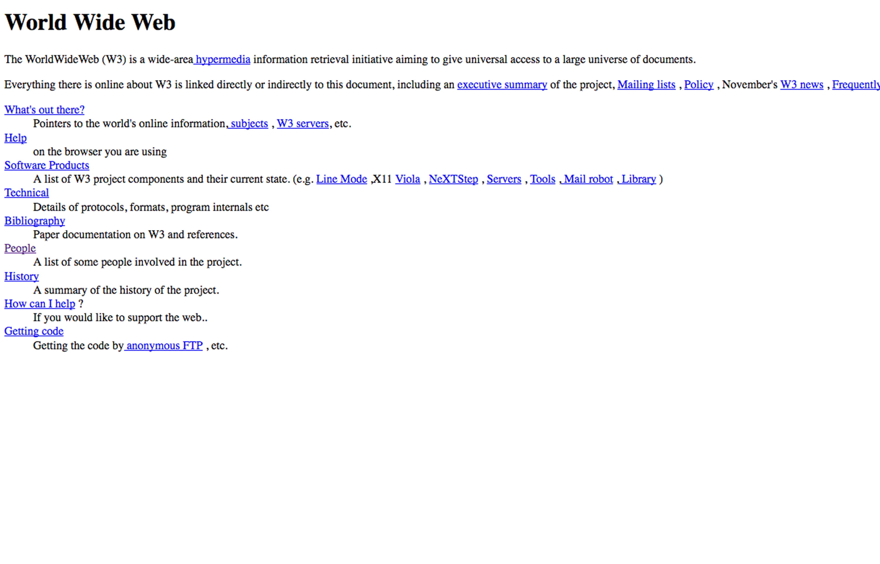 Le premier site disponible sur le World Wide Web n’était autre que la description même du projet WWW. Un méta-site-web en quelque sorte, créé par le CERN lui-même. Le site a initialement été lancé sur l’ordinateur de Tim Berners-Lee, un NeXT. C’était en 1991.
