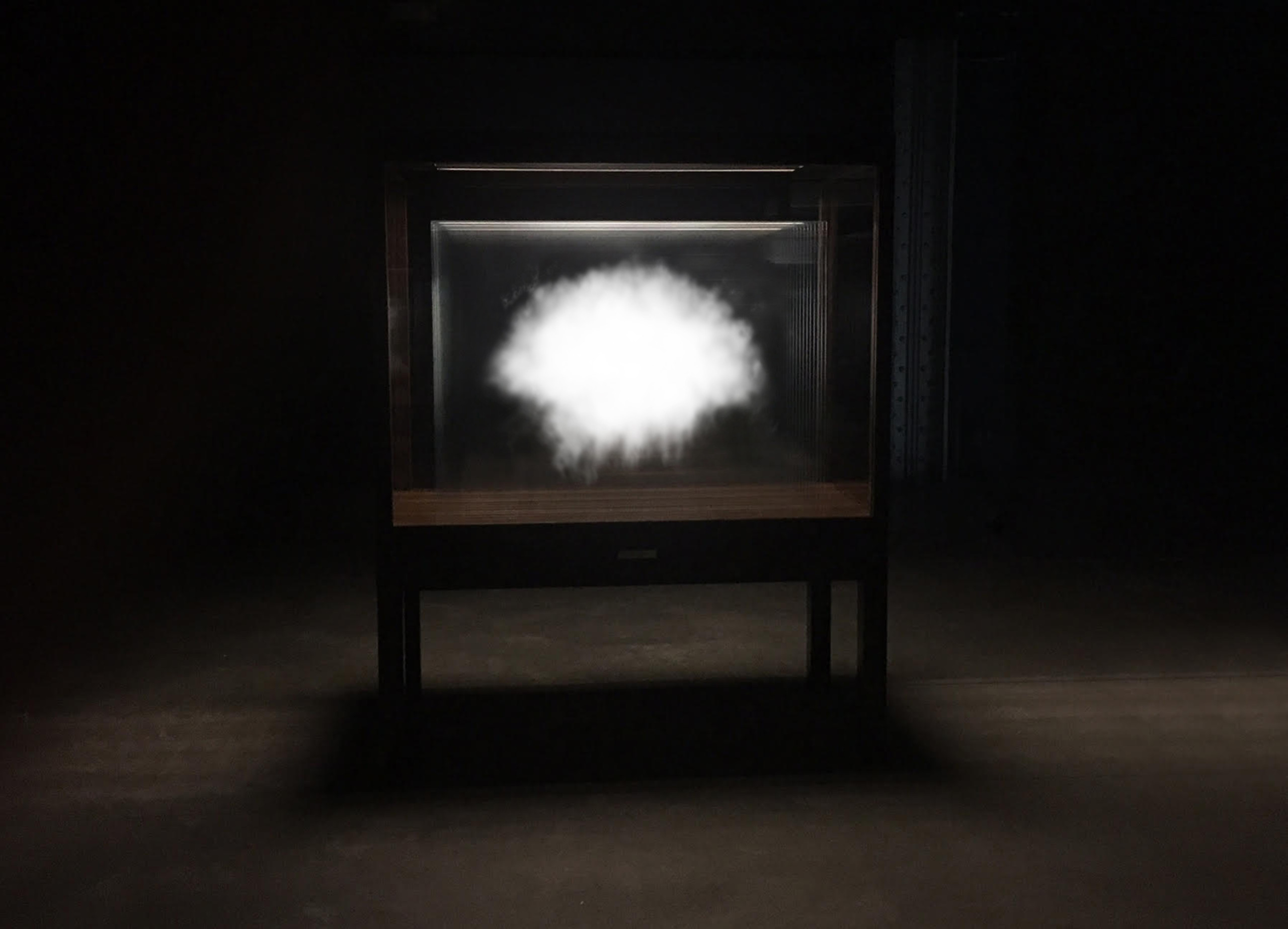 Extra clear glass, ceramic ink digital printing, wooden vitrine, led lights, 199,5 x 175 x 81 cm.
