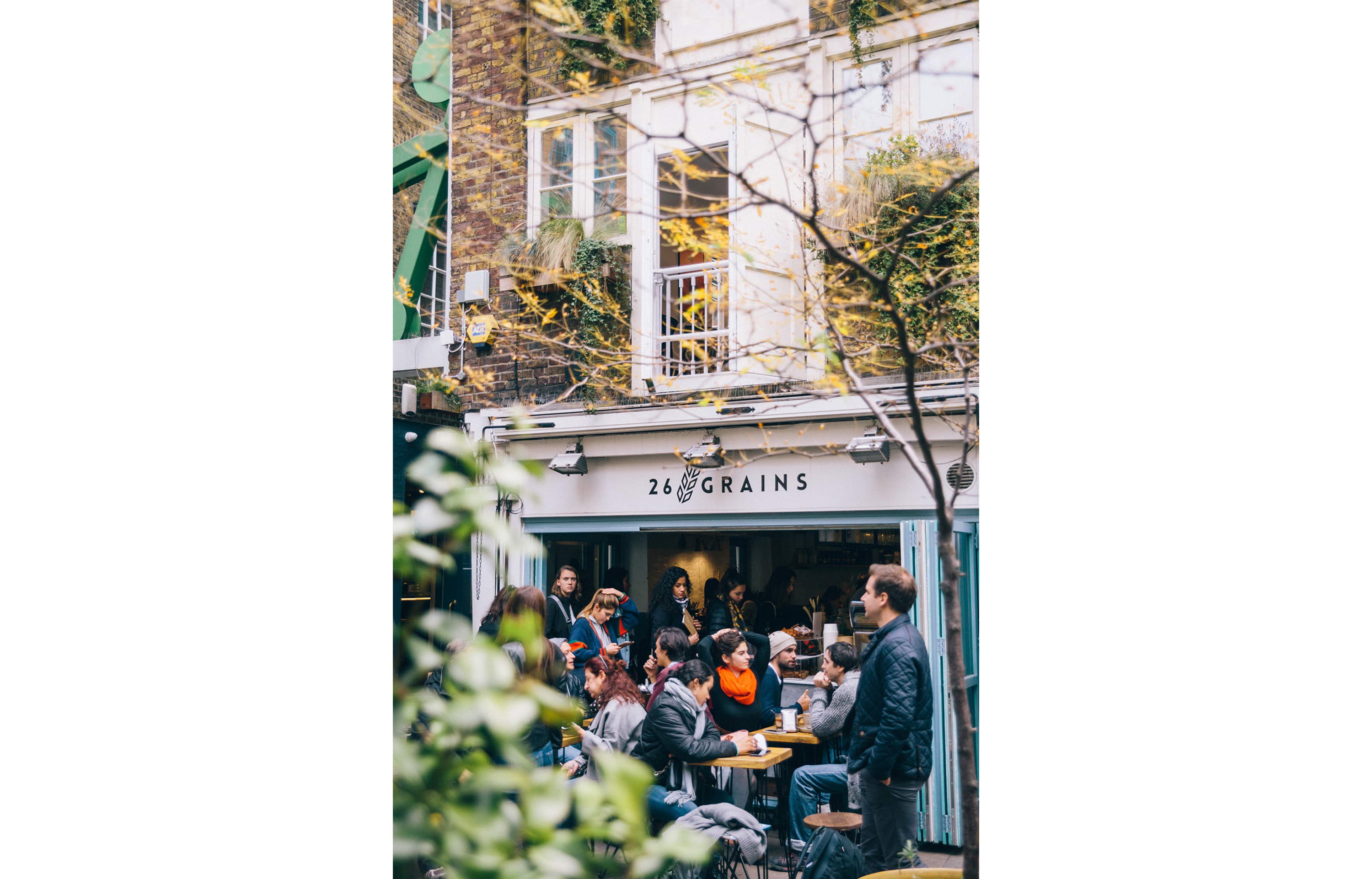 26 Grains, Camden, Covent Garden. Dans ce décor de théâtre qu’est Neal’s Yard, minuscule placette nichée au creux d’une ruelle, il y a de quoi se réconcilier avec le porridge, qui, avouons‑le, ne plaît vraiment qu’à ceux qui ont grandi avec. Il constitue ici l’essentiel de la carte du petit déjeuner, cuit lentement comme il se doit, agrémenté de fruits, de noix, d’épices… de quoi composer un parfait breakfast avant de prendre la ville d’assaut. Le midi, le porridge laisse place à des plats bien ficelés, végétariens (mais pas végans), sortis de la minuscule cuisine en prise directe avec la petite salle. S. B.