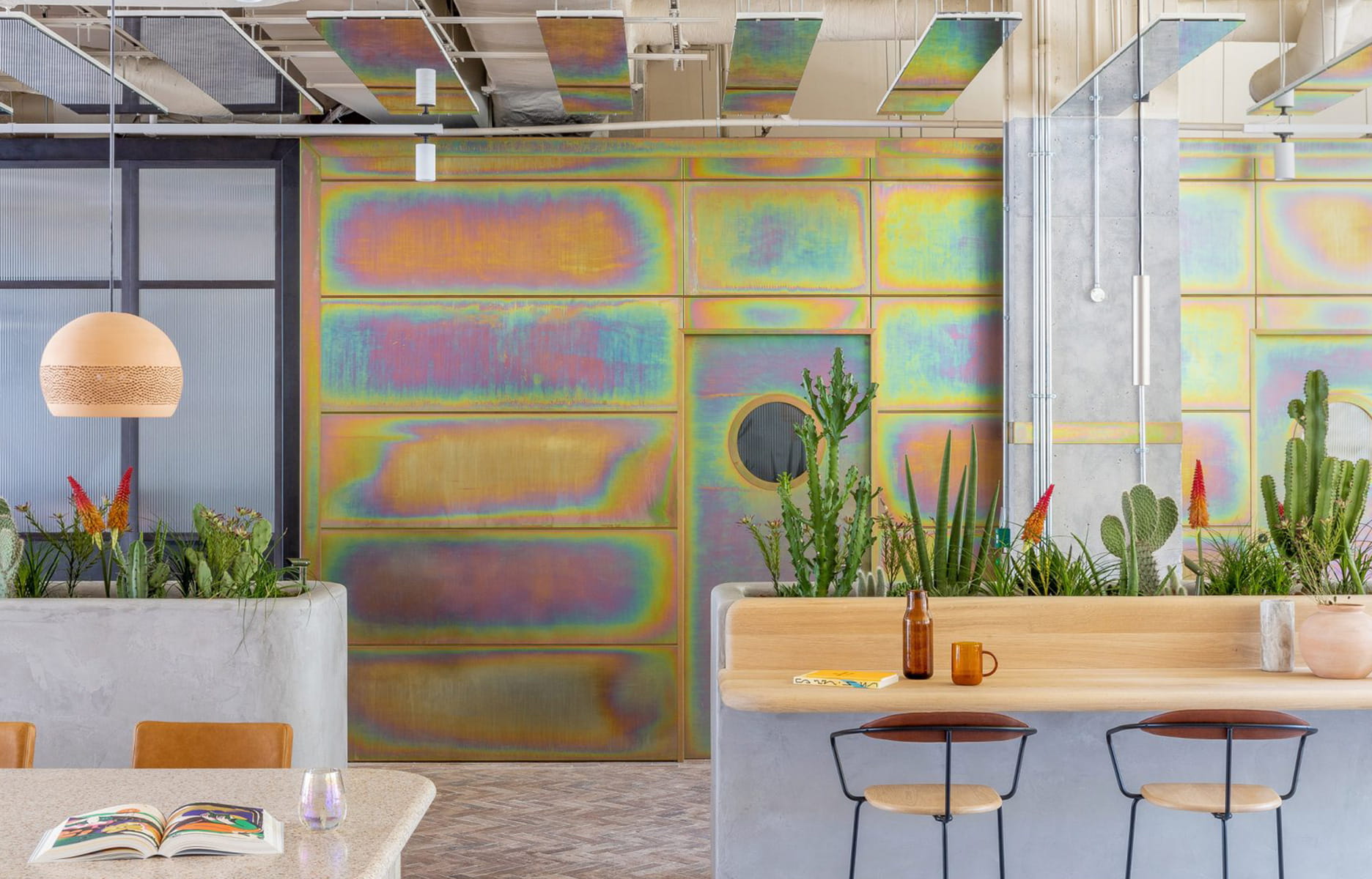 Bermonds Locke, Londres. Après Édimbourg, Manchester et deux adresses à Londres, la chaîne d’apparthôtels londonienne Locke récidive avec une troisième adresse dans la capitale britannique. Situé à Bermondsey, près de Tower Bridge, Bermonds Locke abrite 143 chambres équipées d’une cuisine, un restaurant, un bar, une salle de sport et un lobby qui fait office d’espace de coworking. Les architectes londoniens de Holloway Li ont infusé l’établissement d’inspirations californiennes : miroirs au plafond dès l’entrée pour recréer les mirages du désert de Mojave, également représenté par le choix des plantes – cactus et succulentes – et les tons neutres et minéraux gris, beige, brun et or de la palette utilisée pour décorer les chambres et les parties communes. Le choix des matériaux – béton brut, bois et zinc – va dans ce sens. Des panneaux de zinc, justement, ont été décapés et traités au phosphate pour obtenir une teinte irisée. Une teinte comme un clin d’œil au parc national de Joshua Tree, très coloré et… lieu privilégié des amateurs de substances psychotropes. J. C.