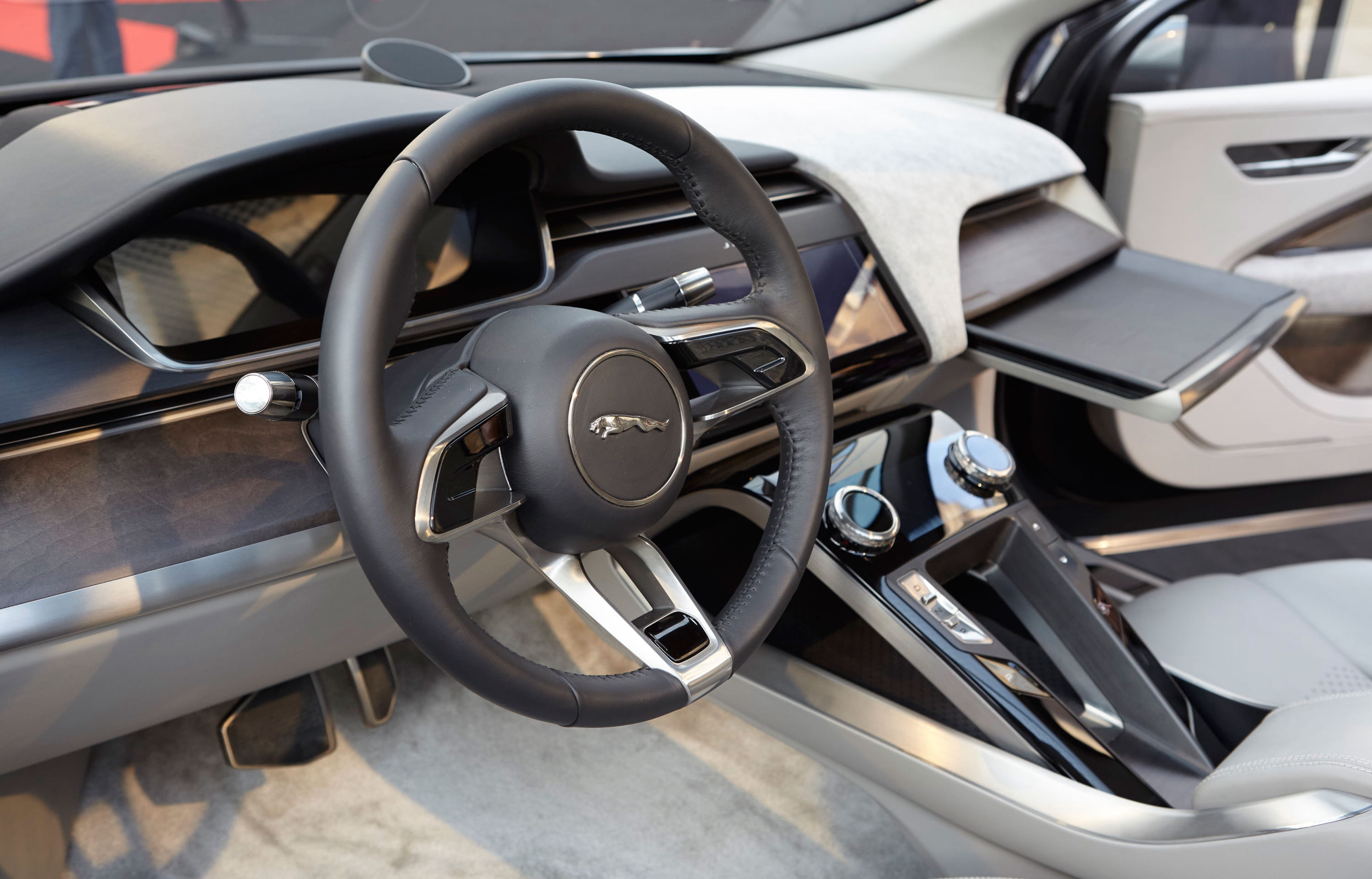 Le résultat est surprenant, avec un habitacle digne d’un salon dans un gabarit compact et, surtout, sans éléments gênants au niveau des jambes. « Les lignes intérieures sont fluides, élégantes, légères, avec un effet presque aérien, amplifié par la lumière dégagée par l’immense toit en verre. L’élégance est accentuée par la console centrale suspendue, et des sièges légers. La position de conduite plus basse que dans les SUV traditionnels apporte un côté plus sportif. Les matériaux utilisés renforcent l’impression de confort dégagée, la ronce de noyer et les éléments métalliques viennent se contraster, tout autant que les affichages digitaux très modernes et très intuitifs. » Autre aspect de confort non négligeable propre à l’électrique : le silence. « C’est une inspiration pour Jaguar, et cela remet en perspective une image de performance », appuie Julian Thomson.