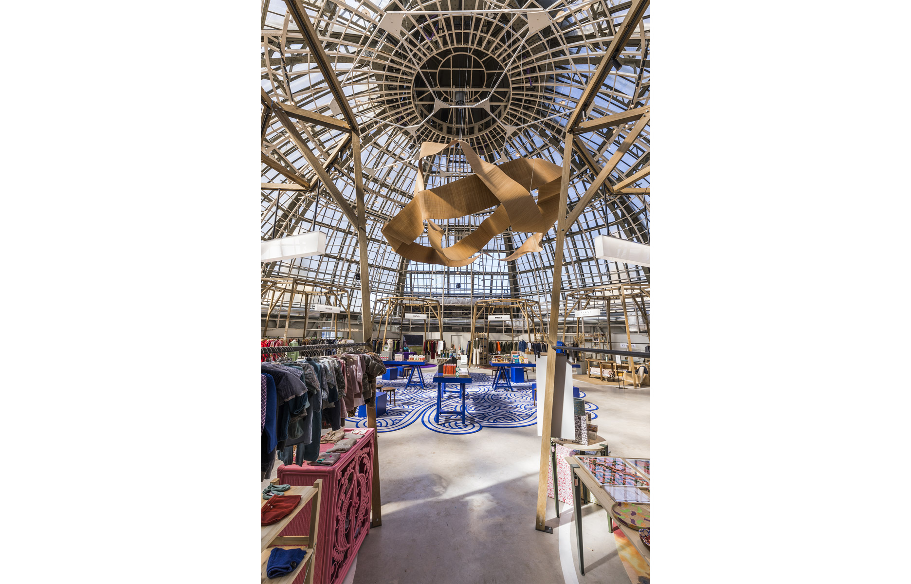 Pour trouver le second lieu du 7eme Ciel, il faut se rendre sous la Coupole Binet. Sous ce dôme de verre et d’acier, ancien réfectoire – la chance ! – des employés du Printemps, neuf pop-up stores abrités sous des structures en bois, se réunissent autour de « la seconde main, l’upcycling, la customisation ou encore la réparation ». Parmi les invités, Brut, qui revisite les vestiaires de travail et militaire, Relique, spécialiste du surcyclage de pièces des années 70 et 80, Docteur Sneaker, ripolineur de baskets, et Tilli, artisan couturier qui répare, transforme et personnalise les vêtements usés. En bref, une offre complémentaire au Second Printemps : je viens acheter une pièce de créateur, je m’offre une personnalisation ; je viens faire réparer mon pantalon, je flashe sur un manteau en cachemire. Malin.