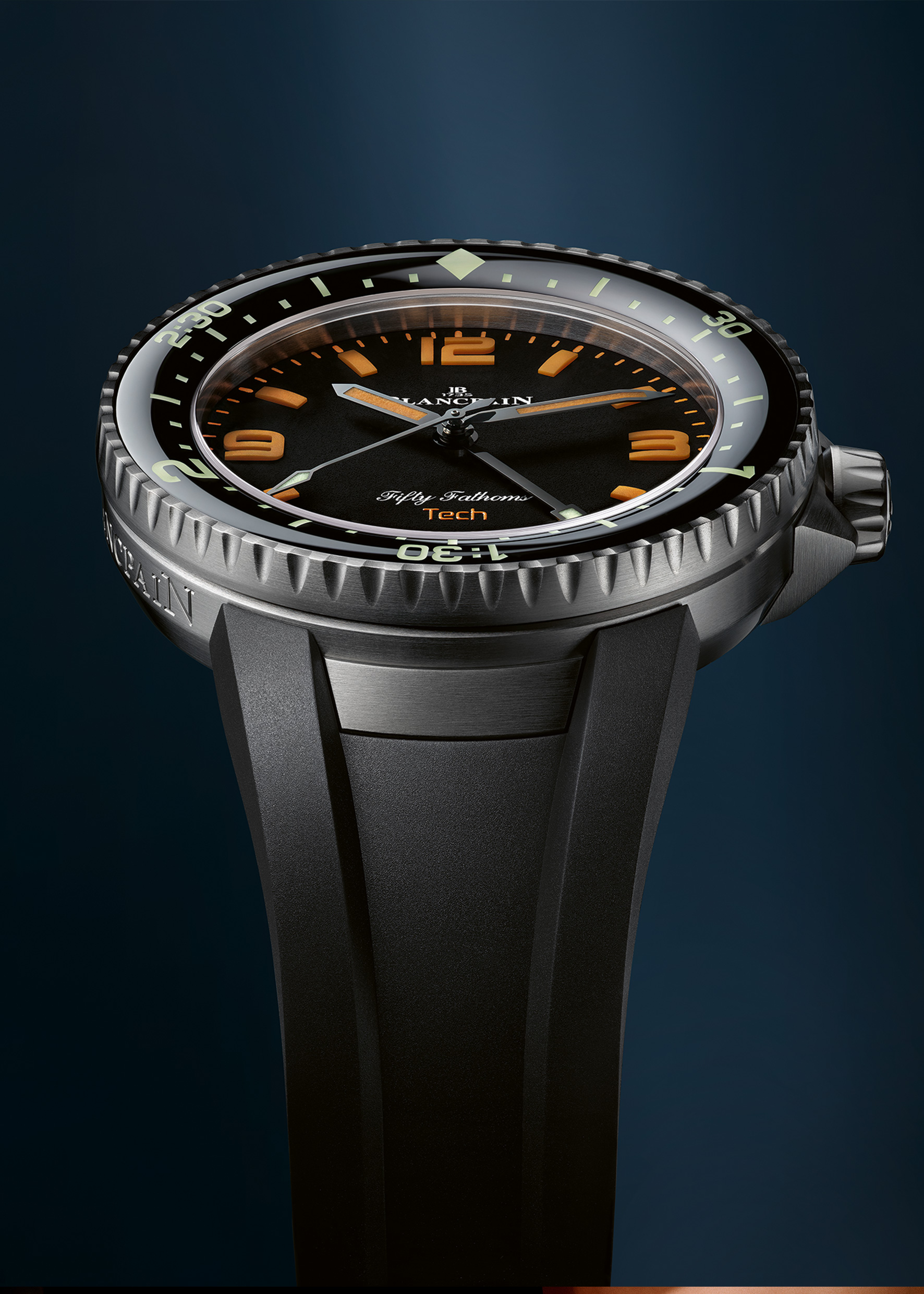 Il est équipé d’une valve à hélium pour mieux supporter les phases de décompression. Blancpain a opté pour un cadran d’un noir absolu, qui capte près de 97 % de la lumière et offre une lisibilité supérieure dans la pénombre aux aiguilles et index. Enfin, la montre se pare de cornes centrales rapportées, fixées directement dans la carrure.
