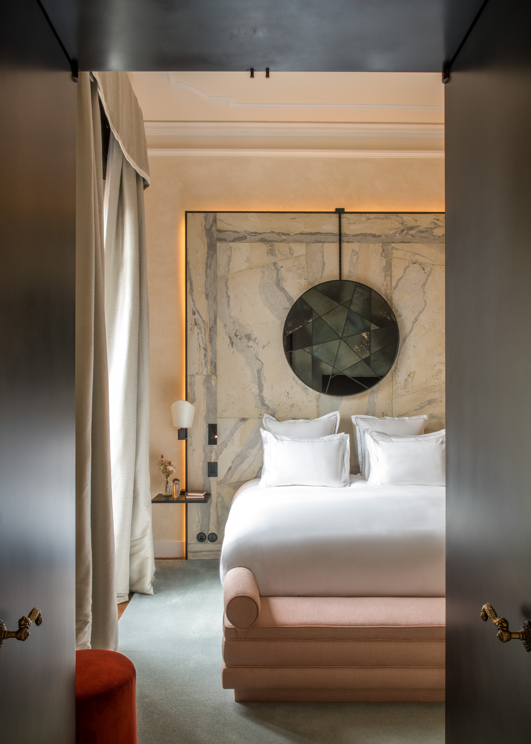 Ici, le contexte est tout autre. Le Nolinski Venezia s’est installé à quelques canaux de Piazza San Marco, Calle Larga XXII Marzo, dans les murs de l’ancienne Bourse du Commerce. Un bâtiment classé parmi les monuments historiques de la ville. D’où le premier défi majeur du groupe Evok : « transformer des bureaux à usage commercial avec des contraintes architecturales énormes« . « Le bâtiment qui a dicté l’architecture d’intérieur de l’hôtel, pas l’inverse« , ajoute Emmanuel Sauvage quant à la mission confiée à l’architecte Alberto Torsello, originaire des Pouilles et installé à Venise depuis 2006, et au binôme Yann Lecoadic & Alessandro Scotto.