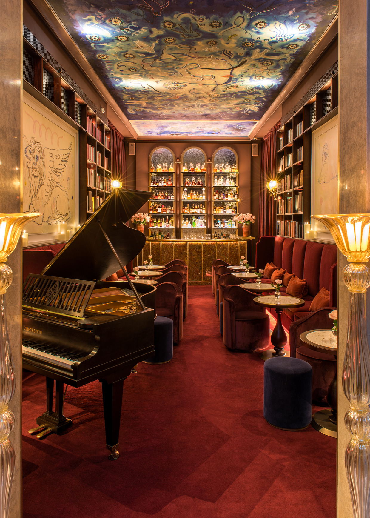 À quelques marches du restaurant, le “Bar Bibliothèque” se dévoile, espace intimiste dont on profite pour siroter un cocktail de la carte signée Jeremy Bacquet après le dîner, ou pour un instant lecture dans l’après-midi. Le choix est large, très large : plus de 4 000 livres choisis par Anatole Desachy sont rangés sur 64 mètres linéaires, près de la moitié évoquant l’art, l’autre moitié consacrés aux thèmes historique et de voyage. Parce que l’hôtel est parsemé de références marines, on trouve dans cette bibliothèque aussi une fresque de Simon Buret, « Ici les oursins sont des étoiles », un ciel comme une mer sur le plafond de la pièce.