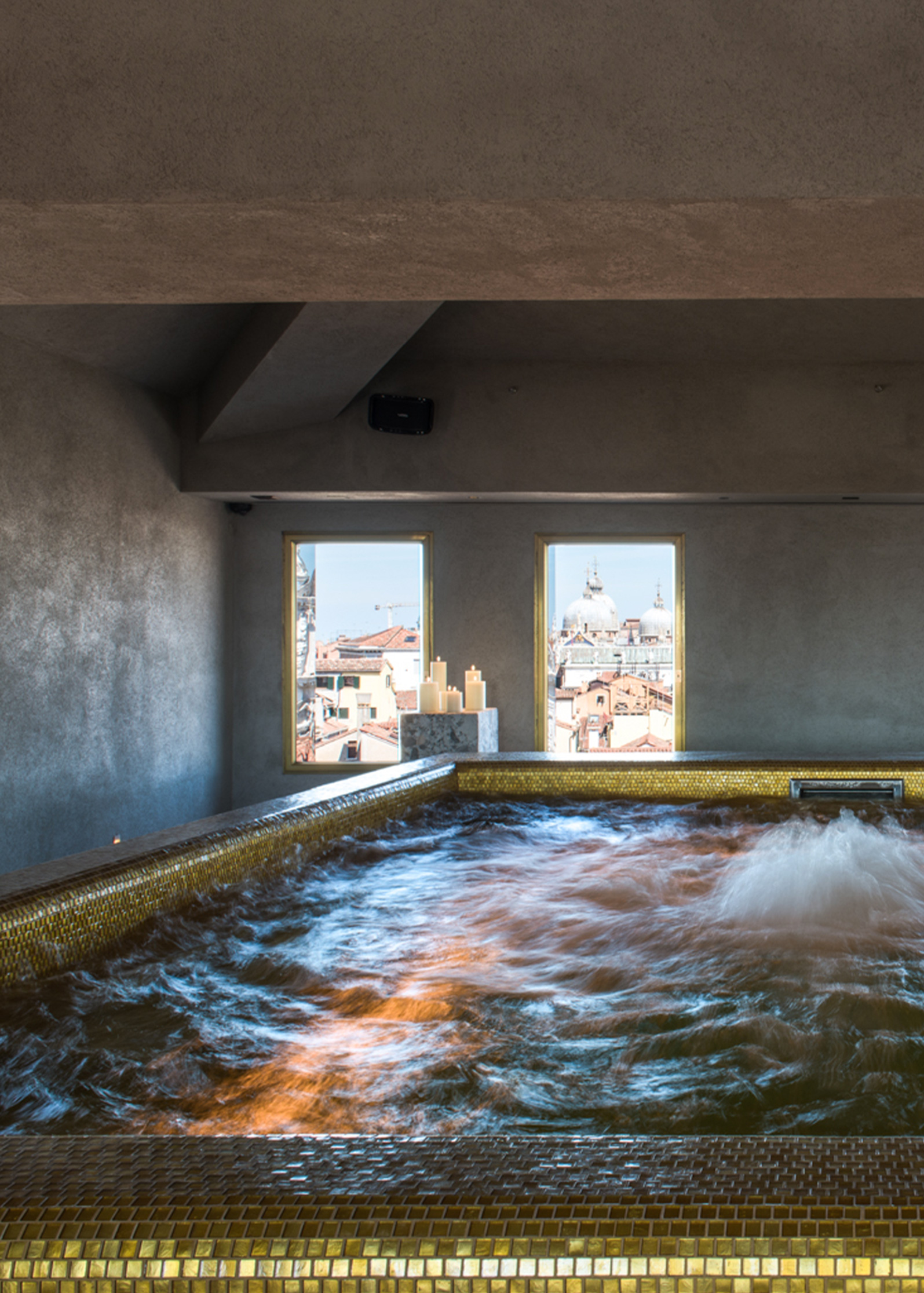 Il s’agit du Bassin, une salle avec piscine au milieu offrant une vue à 360° sur les toits vénitiens. Ici, la charpente en béton, avec ses sols et ses murs de pierres, met en valeur la mosaïque dorée d’inspiration bizantine qui habille le couloir de nage, dont les tesselles favorisent des jeux de lumière qui rappellent directement ceux des dorures de la basilique San Marco. À l’heure du coucher de soleil, un bain s’impose avec comme toile de fond les sommets illuminés de Venise. Dominer la ville et en même temps être dominé par elle n’a jamais été si réel. La cerise sur le gâteau d’une expérience hors du temps.
