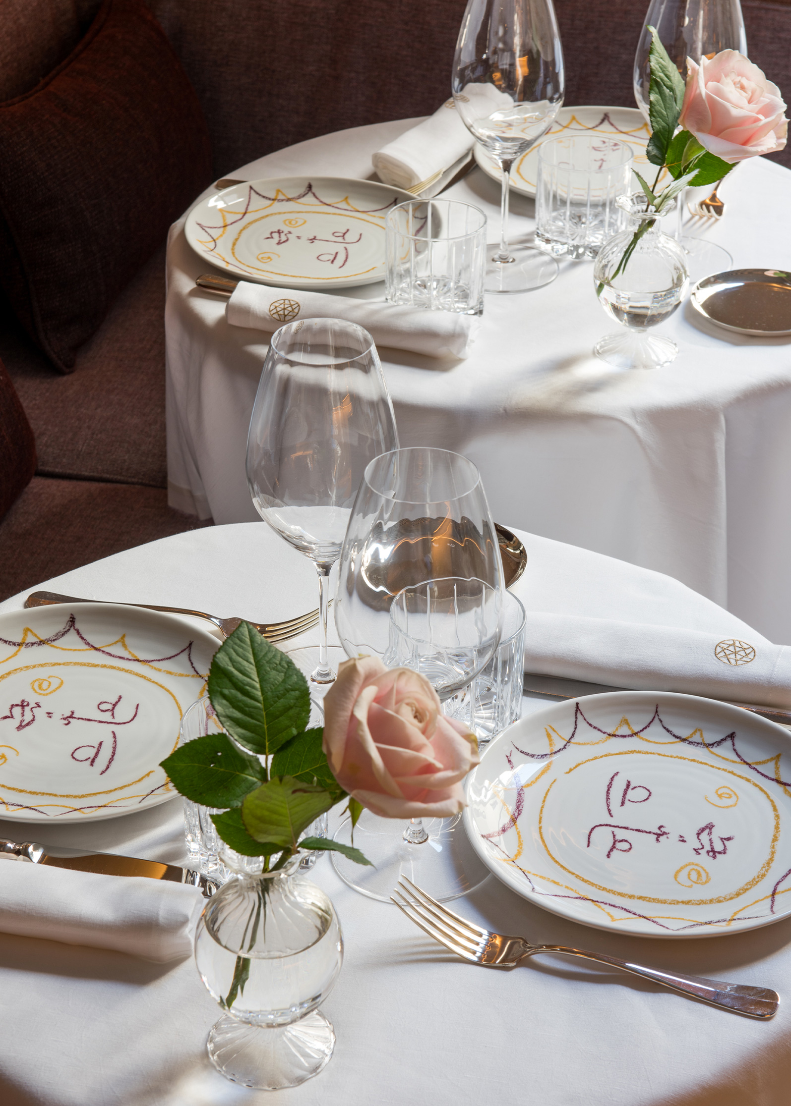Au troisième étage, l’amphithéâtre de l’ancienne Salle du Conseil abrite le Palais Royal, le restaurant gastronomique de l’hôtel. À première vue, on a l’impression d’entrer en scène, spectateur et acteur à la fois. Ce sont peut-être les balcons en coursive qui se détachent, là-haut, et mettent en valeur la majesté d’une salle haute de sept mètres. Ou encore les grandes arches byzantines se répétant tout au long de la pièce et lui donnant un rythme circulaire, repris par les tables où l’argenterie brille et se reflète dans la verrerie. Un grand lustre datant des années 50, ainsi que des appliques de la même époque, illuminent la pièce.