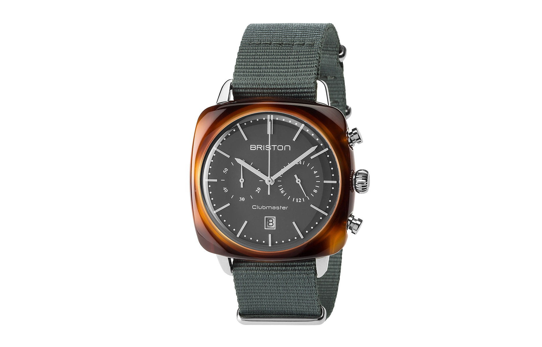 Lancée en 2012 par Brice Jaunet, dont le grand-père était le cofondateur de New Man, Briston est une marque française de montres chic à prix raisonnables. Sa nouvelle Clubmaster Vintage Chronograph s’habille d’un boîtier en acétate de forme coussin et reçoit un bracelet Nato. L’ensemble véhicule un puissant esprit rétro.
