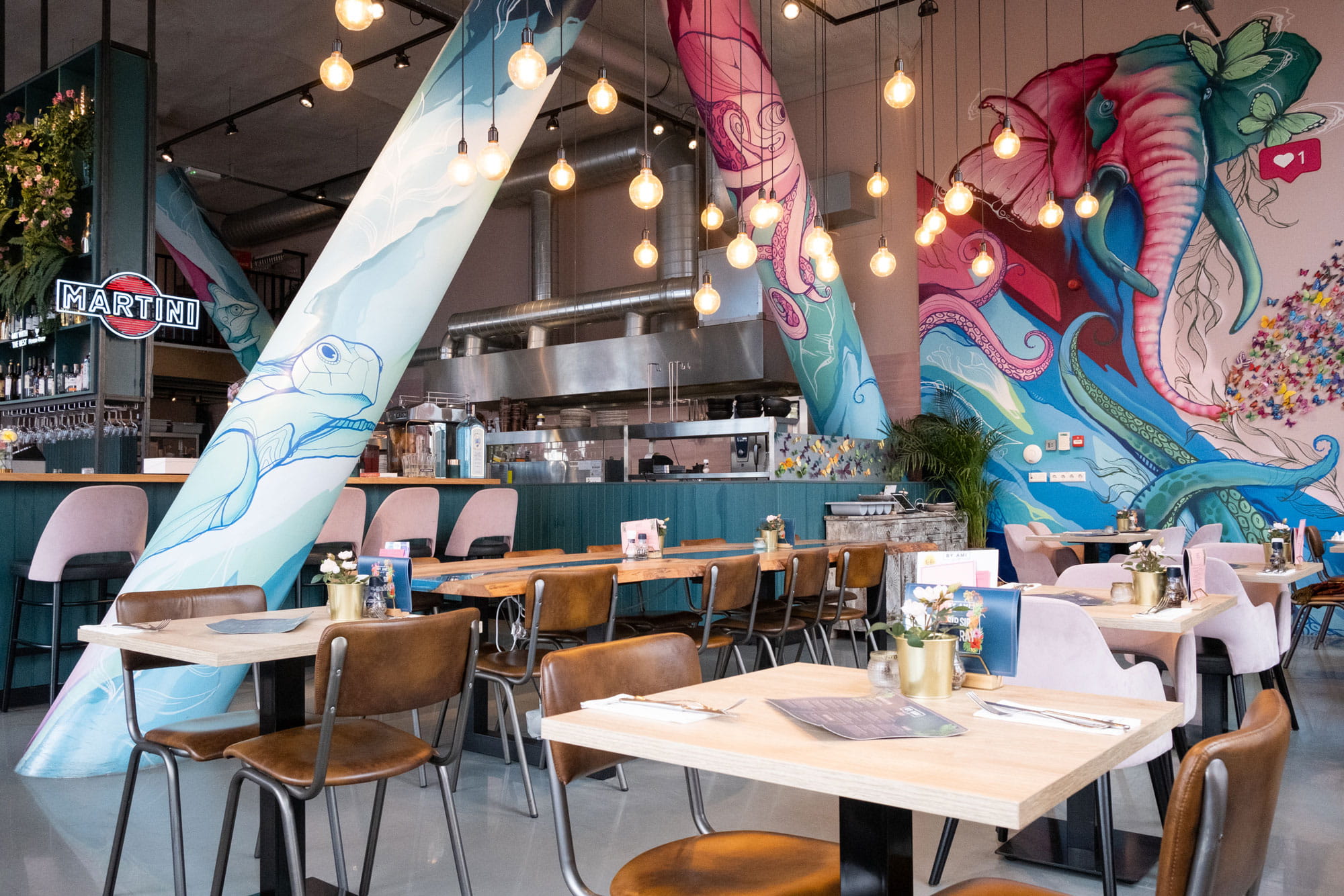 À l’intérieur, une déco toute en tons roses et bleus accompagne les peintures murales colorées de l’artiste néerlandais Jeroen Van de Wier. Le restaurant propose une carte à la cuisine variée et internationale. Burgers, sandwiches, salades… les options végétariennes ne sont pas en reste. Tous les ingrédients de By Ami sont issus d’une agriculture durable et l’on nous souligne même que l’électricité utilisée pour faire tourner le restaurant est complètement verte. Si la ligne est définitivement hype, l’atmosphère n’en reste pas moins agréable et accessible. Le service est ultra-friendly, comme à peu près partout où l’on ira ces deux jours.