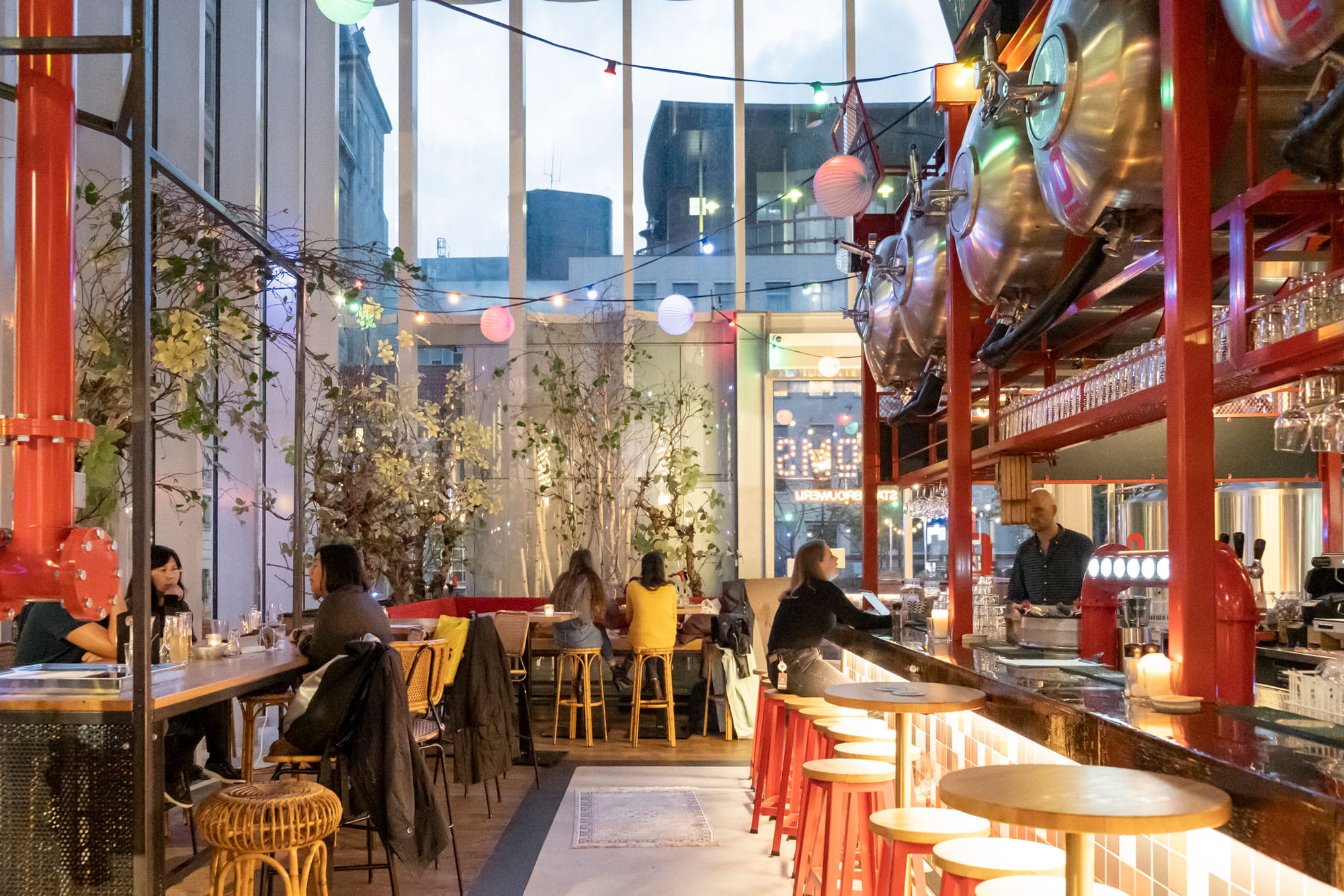 Nous regagnons en à peine une demi-heure le centre-ville par le tram, direction Thoms Stadsbrouwerij. Avec ses immenses baies vitrées, ses grandes cuves métalliques suspendues au-dessus du bar et les loupiotes de couleur qui ornent l’intérieur du bar comme la grande terrasse, l’atmosphère y est chaleureuse et conviviale. Ce bar (le plus long de Rotterdam) brasse également ses propres bières sur place, toutes non pasteurisées et non filtrées.
