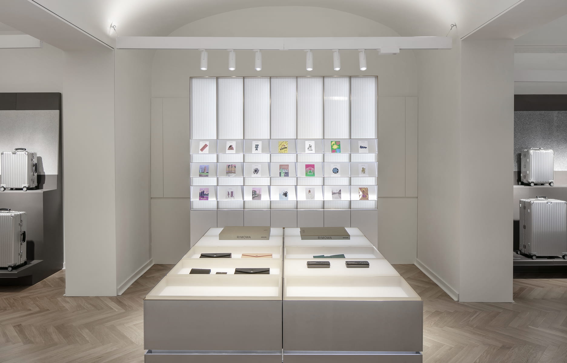 Dans ce flagship store, on découvre le voyage d’une valise Rimowa aux côtés de son (heureux) propriétaire. Des bagages aux lignes verticales parallèles devenues iconiques qui trônent sur des piédestaux comme des statues dans un musée. L’aluminium, « le » matériau classique de la firme est omniprésent et une grande place est faite aux accessoires.