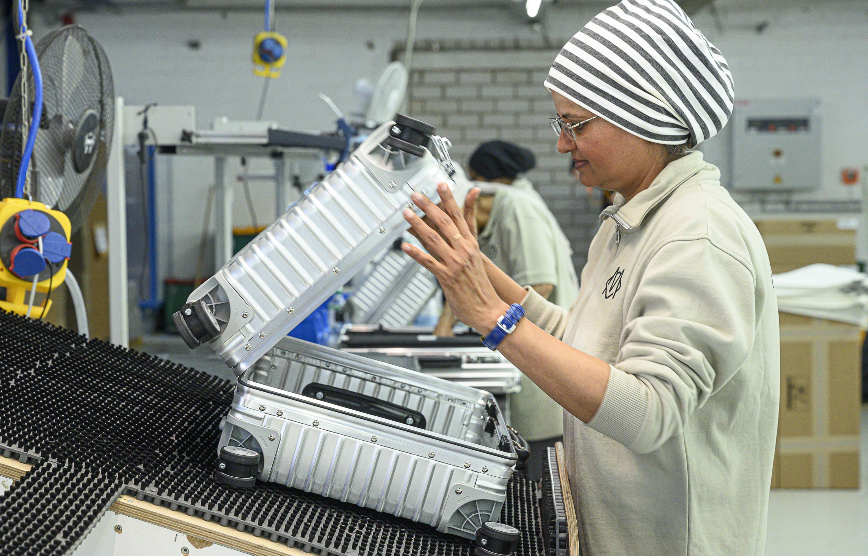 A une quinzaine de minutes de la cathédrale gothique de Cologne, chef-d’œuvre architectural du XIIIe siècle irradiant toute la ville, l’usine – qui abrite aussi le siège de la marque – occupe 40 000 m2 d’ateliers, tous logés sous une charpente ondulée et métallique rappelant la silhouette du bagage iconique. Chaussures de sécurité aux pieds, la visite sous escorte fait franchir plusieurs barrages avant l’arrivée dans une première zone consacrée aux phases de « préparation et préproduction ». Une ambiance à la RoboCop, où les machines semblent avoir pris le pas sur l’homme. Des bijoux de technologie classés secret défense impossibles à photographier pour éviter tout risque de copie.