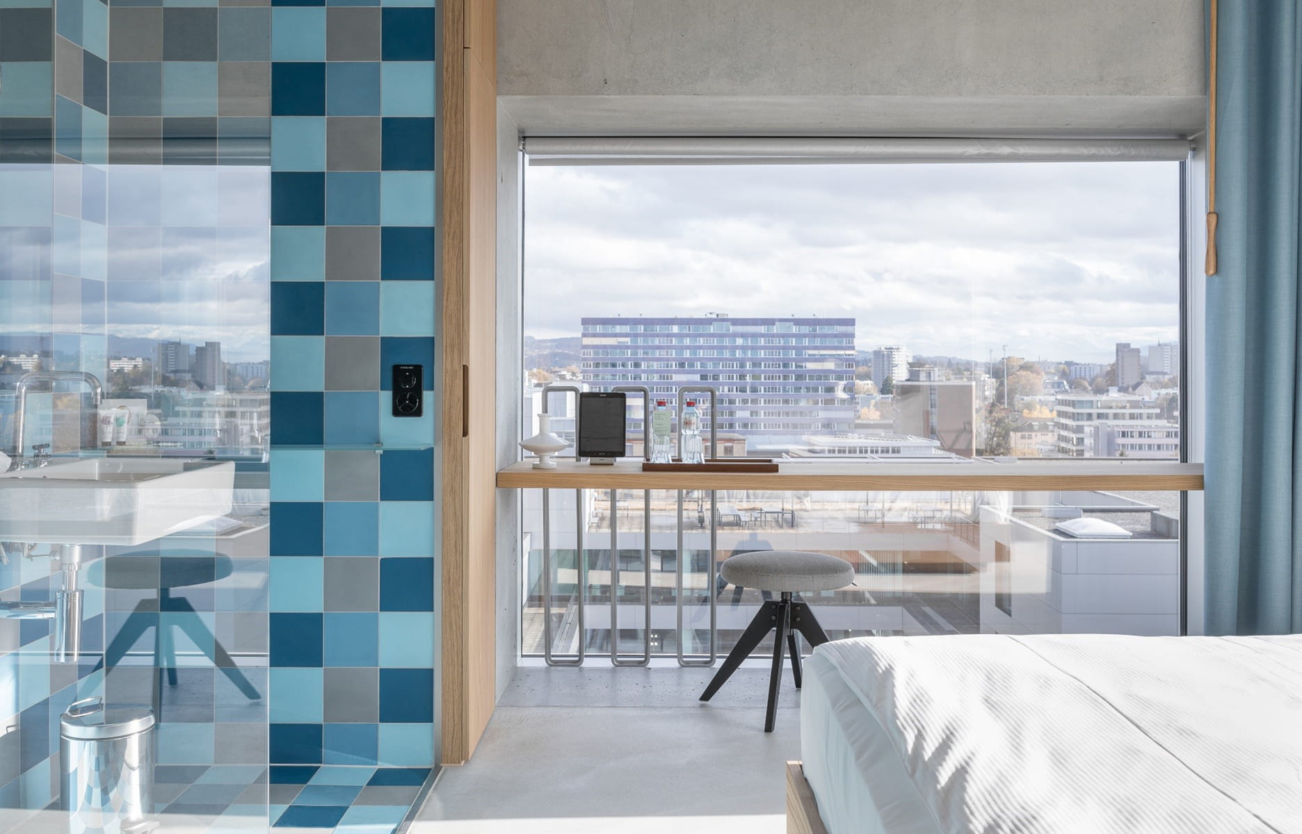 • Placid, business. La plus belle vue sur Zurich, c’est depuis le quartier tertiaire d’Altstetten qu’elle s’apprécie. Là, entre les sièges de Siemens ou de Nexus Telecom, on a tout récemment érigé un parallélépipède des plus stricts que les hommes d’affaires pressés, mais esthètes, plébiscitent. Un calme olympien, du béton ciré partout et des chambres scandinavement épurées, à choisir dans les étages supérieurs, où l’on travaille confortablement, à moins qu’on ne laisse le regard se perdre à travers les baies vitrées XL : Alpes enneigées au sud, collines bourgeoises au nord, paysages industriels à l’ouest. Un concentré de Suisse !
